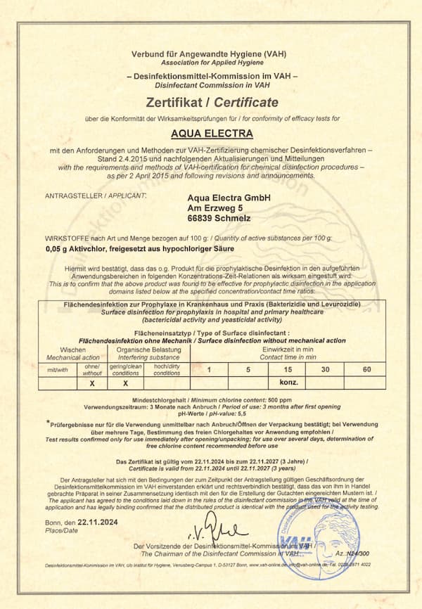 Nos complace anunciar que, tras un largo proceso de evaluación, finalmente hemos sido incluidos oficialmente en la lista de la VAH con AQUA ELECTRA. La VAH, Asociación para la Higiene Aplicada (VAH) e.V., solo certifica e incluye en su lista aquellos productos que cumplen los requisitos de calidad publicados por la Comisión de Desinfectantes de la VAH. Con la inclusión de AQUA ELECTRA en la VAH, los productos ahora también pueden utilizarse oficialmente para la desinfección rutinaria y profiláctica en hospitales y consultas médicas, así como en instituciones públicas y otros ámbitos en los que se puede transmitir infecciones.